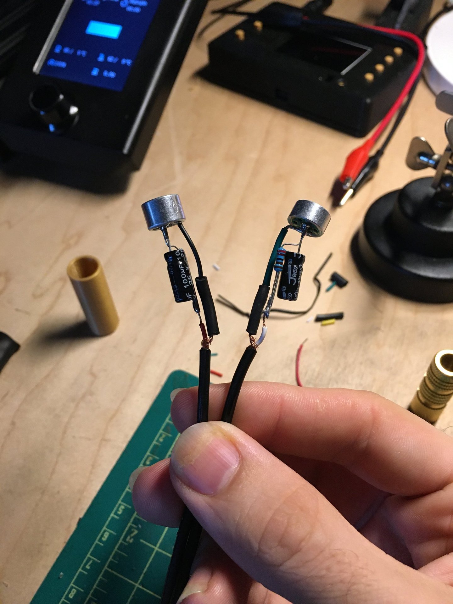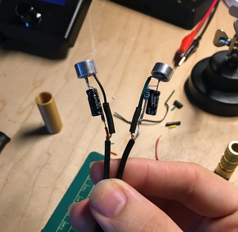 My first attempt to construct a hydrophone involved a pair of omnidirectional electret capsules mounted inside a 3D-printed shell and then dipped in Plasti-Dip to water seal them. However, the capsules themselves did not survive contact with the Plasti-Dip, as their output was drastically reduced and muffled.